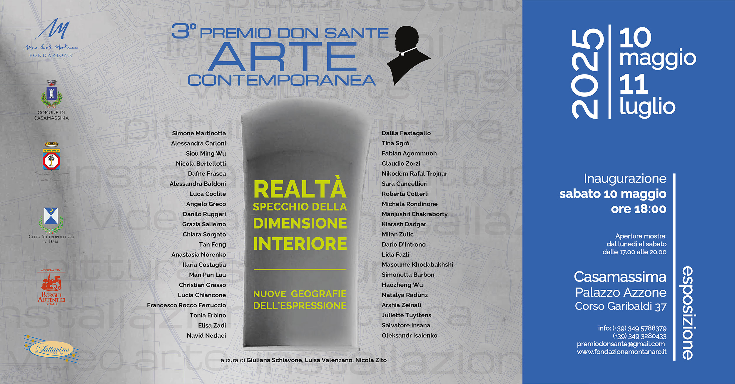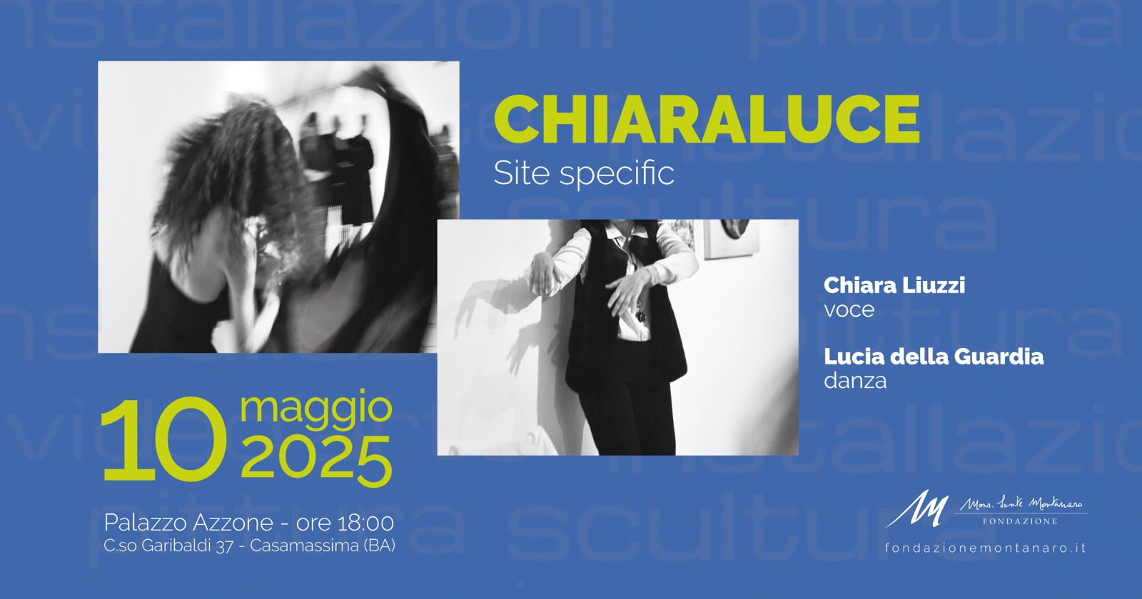Sabato 10 maggio 2025, alle ore 18.00, presso Palazzo Azzone a Casamassima, si apre ufficialmente la mostra del 3° Premio Don Sante per l’Arte Contemporanea, con un evento inaugurale d’eccezione: la performance "Chiaraluce – site specific", a cura di Chiara Liuzzi (voce) e Lucia Della Guardia (danza).