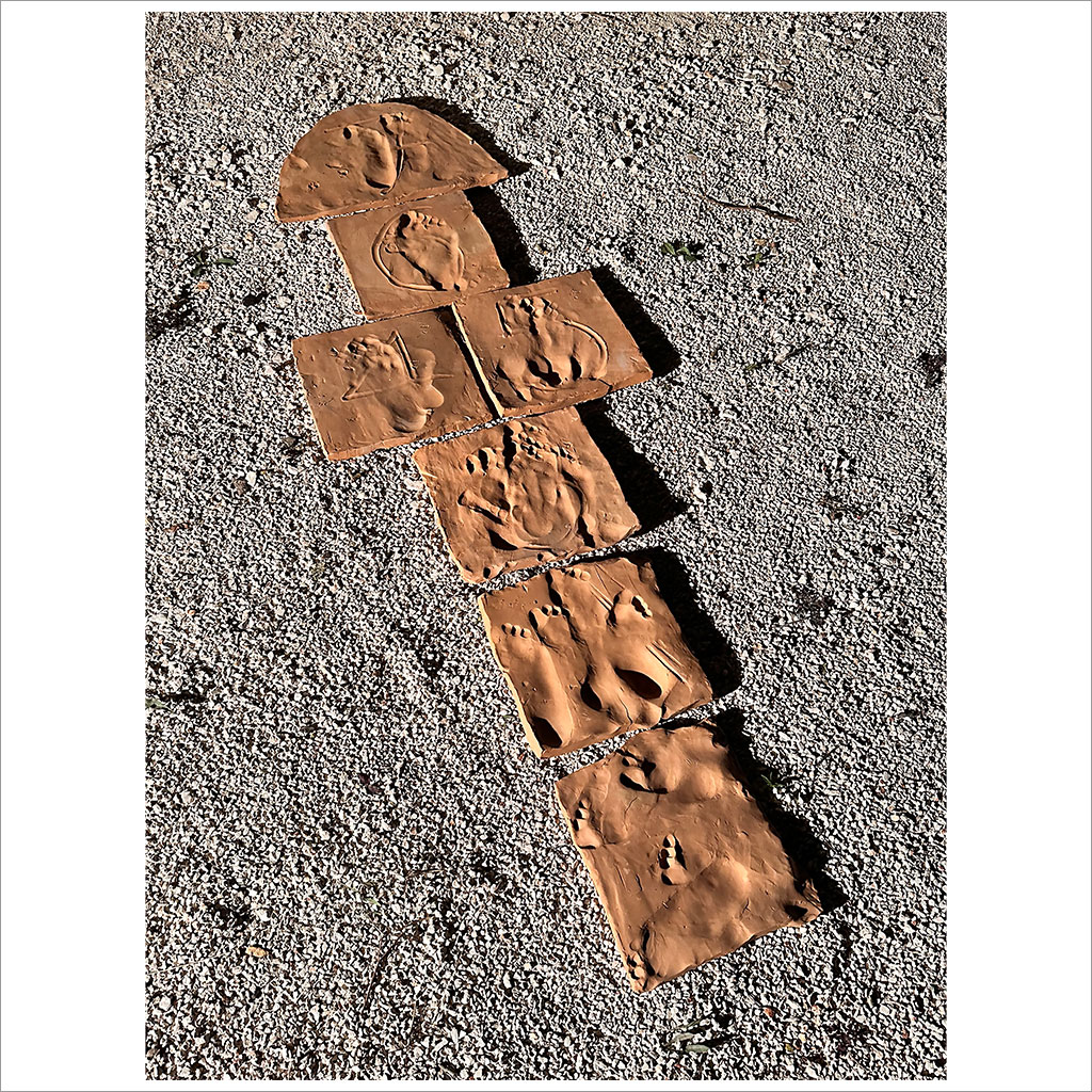 L’opera trasforma il gioco della campana in un dispositivo poetico e rituale, dove l’azione ludica diventa forma di attraversamento simbolico. Il corpo, premuto sull’argilla ancora tenera, imprime una cartografia del movimento, fatta di pressioni, slittamenti e sospensioni. La materia, una volta cotta, conserva l’eco del gesto come indizio di una temporalità stratificata. Il tracciato emerge così come soglia tattile tra esperienza e permanenza, tra leggerezza e incidenza
