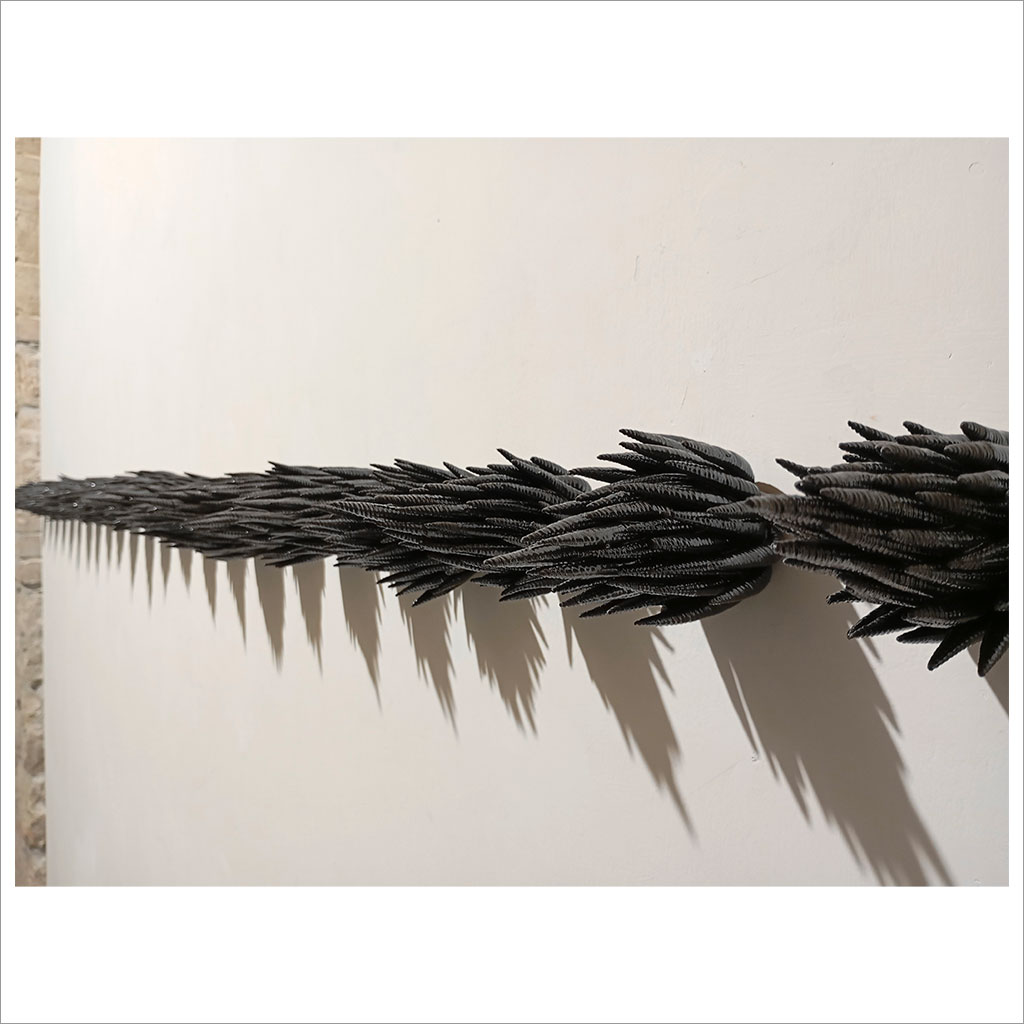 L’opera trae origine dal culto seicentesco delle anime pezzentelle, restituendo forma al gesto intimo e collettivo dell’adozione simbolica dei teschi senza nome. Una linea orizzontale di fiamme ceramiche, nere e lucenti, si staglia dalla parete come soglia tra due mondi, evocando una ritualità silenziosa di cura e resistenza. La memoria si inscrive nella materia fragile e refrattaria, che trattiene l’eco del lutto e lo trasforma in atto di prossimità. L’installazione si fa spazio liminale, in cui la pratica artistica si fa politica dell’inclusione e del ricordo
