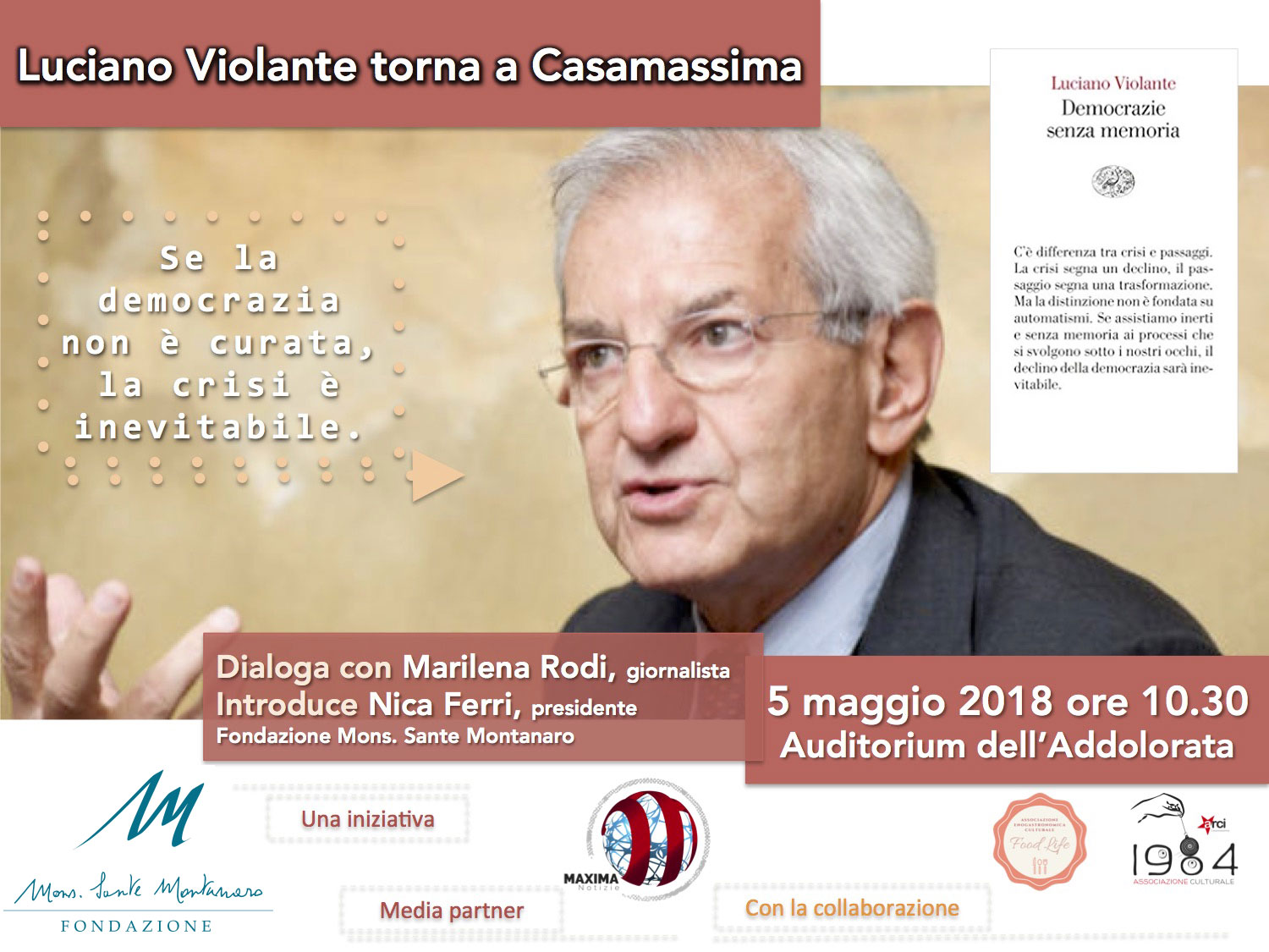 La Fondazione Mons. Sante Montanaro, con la collaborazione di Maxima notizie, dell’associazione ‘Food life’ e dell’associazione culturale ‘1984 Arci’ ospita il ritorno di Luciano Violante a Casamassima, già presidente della Commissione parlamentare antimafia e presidente della Camera dei deputati, oltre che ex magistrato e professore di diritto penale.